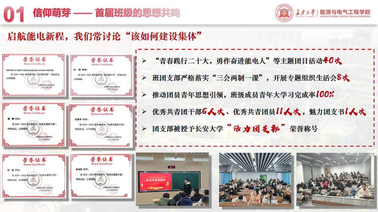 心有所信,方能行远。班级始终把思想政治引领放在首位,推动“向党看齐”融入日常。全班30人全部提交入党申请书,现有党员7人,为学院党员人数最多的班级,党团员占比达93%。严格落实“三会两制一课”,累计开展专题组织生活会8次、主题团日活动40次,青年大学习完成率保持100%,获评长安大学“活力团支部”。班级累计获“优秀共青团干部”6人次、“优秀共青团员”11人次、“魅力团支书”1人次。党员牵头开展学业帮扶33人次,覆盖500余人次,把组织关怀落到实处。