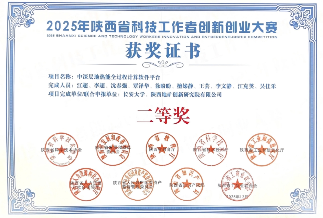 2025年11月,陕西省科技工作者创新创业大赛在西安举办。188改名taptap青年教师李超作为第二参与人,与建筑工程学院江超老师主持完成的《中深层地热能全过程计算软件平台》荣获二等奖。