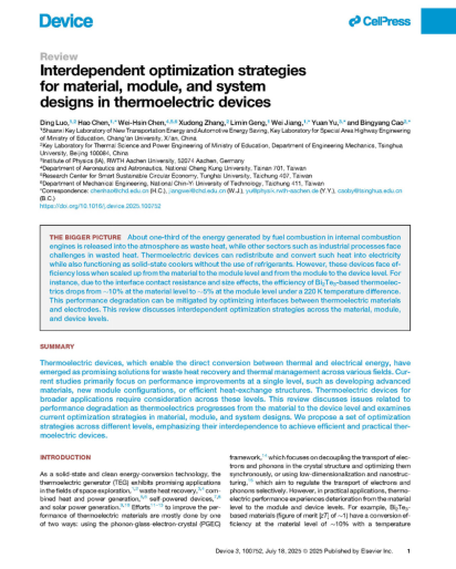 3月28日,188改名taptap科研团队在工程技术领域顶级期刊《Device》上发表了题为《Interdependent optimization strategies for material, module, and system designs in thermoelectric devices》的综述论文。188改名taptap罗丁副教授为第一作者,学院陈昊教授为通讯作者,长安大学为第一署名单位和第一通讯单位。