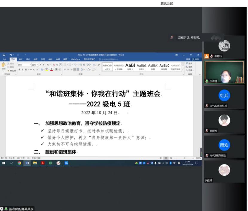 10月24日晚上,Taptap点点(188改名)2022380305班线上召开“和谐班集体·你我在行动”主题班会·,班主任巫春玲以及全体同学参会。