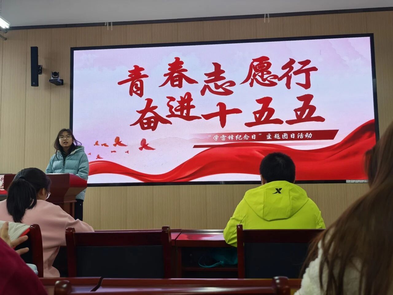 在“青春志愿行,奋进十五五”学雷锋纪念日主题团日活动中,主席团成员雷阳帆进行了发言。她提到今天的雷锋精神早已融入我们的日常,我们青年的“崭新长征路”就是要把个人理想融入国家发展大局,用志愿服务书写青春华章;站在“十五五”的新征程上,从党史中汲取力量,把小我融入大我,用青年的力量和行动传递属于我们的温暖。